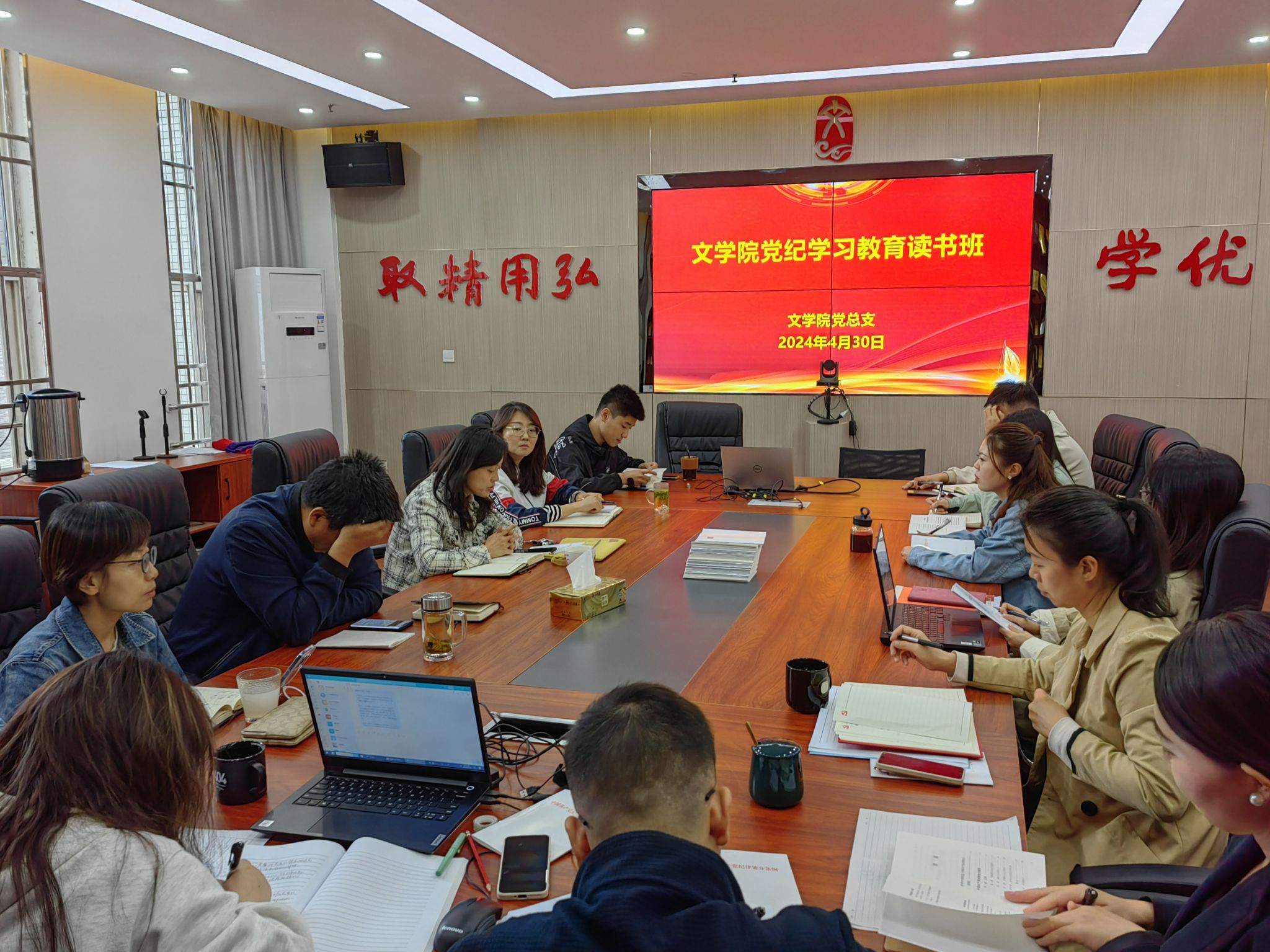 4月30日上午,文学院党总支举办党纪学习教育读书班,深入学习贯彻习近平总书记关于党纪学习教育的重要讲话和重要指示精神,以及新修订的《中国共产党纪律处分条例》。文学院党总支书记李莎莎主持,文学院领导班子成员及行政教辅党支部全体党员参加学习。本次读书班依照学校的安排部署将集中学习和个人自学相结合,围绕党的政治纪律、组织纪律、廉洁纪律、群众纪律、工作纪律、生活纪律开展学习研讨。党总支委员分别就《中国共产党纪律处分条例》...