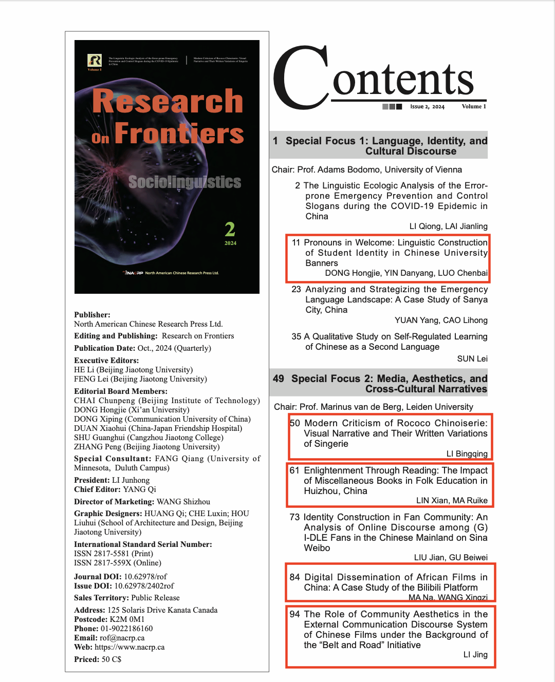 近期,文学院语言文化国际传播与影视戏剧科研平台围绕“话语实践和身份认同”主题,在国际期刊《Research on Frontiers》2024年第2期发表了5篇系列论文。本期特刊由国际知名汉学家,维也纳大学的Adams Bodomo教授和莱顿大学的Marinus van de Berg教授策划,旨在跨越学科界限,深入探讨语言、社会与文化之间复杂而微妙的关系,揭示其内在关联与深远影响。学院科研团队成员董洪杰、马娜、李静、李冰清、林贤本次发表的系列论文,从语言学、...