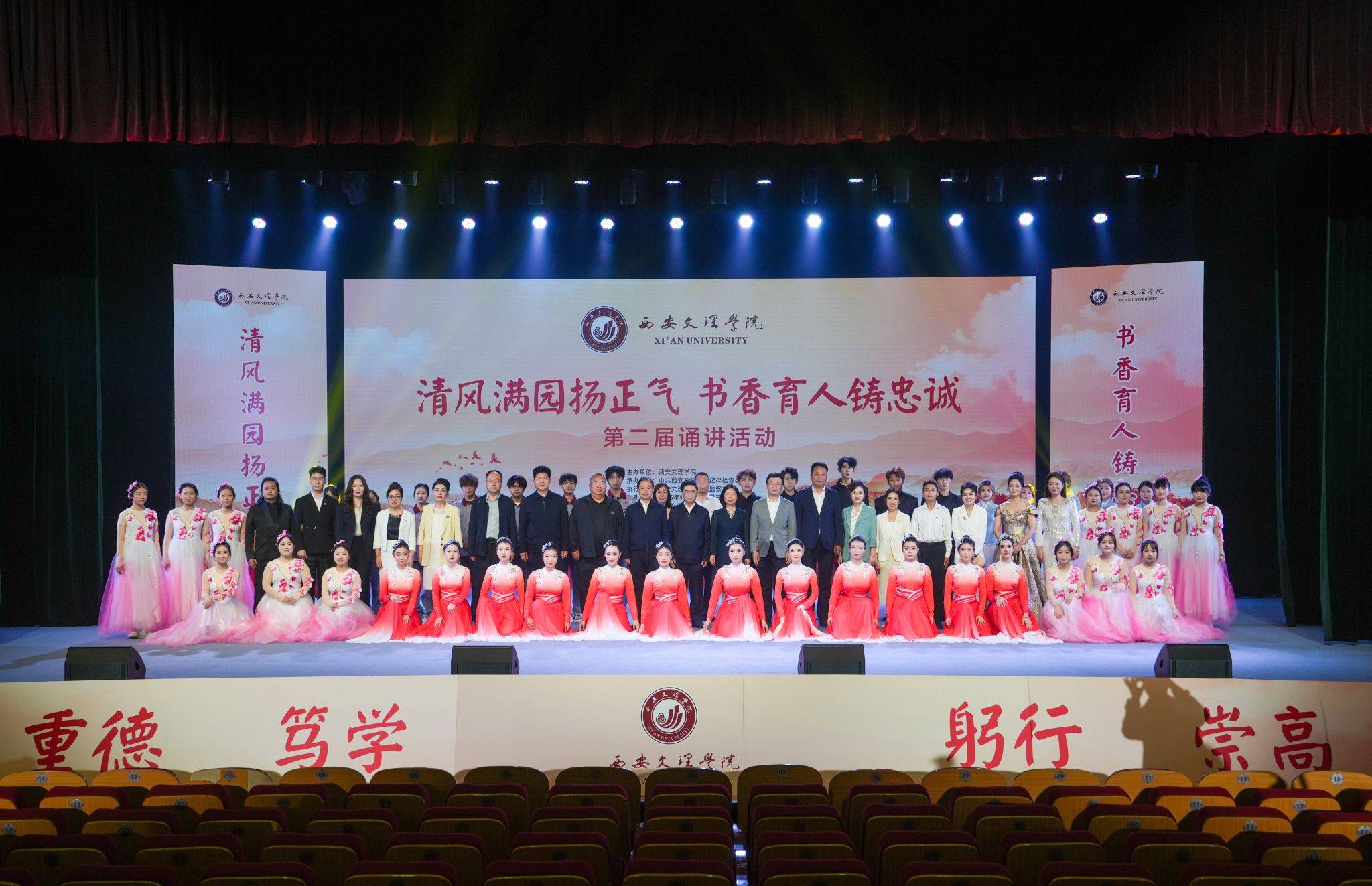 在学校第四次党代会胜利闭幕之际,为学习贯彻党代会精神,深化“清廉校园”建设,4月16日,学校举办“清风满园扬正气,书香育人铸忠诚”第二届诵讲活动。活动以“追梦·信念·忠诚”为主线,通过舞台艺术与深情讲述,展现了全校师生追梦文理、坚定信念、忠诚向党的精神风貌。全体校领导及师生代表800余人参加活动。活动以歌伴舞《清风颂》拉开帷幕,“追梦文理”篇章中,《教师的光荣不仅仅是燃烧自己》《努力事躬耕,但愿成嘉禾》等,...