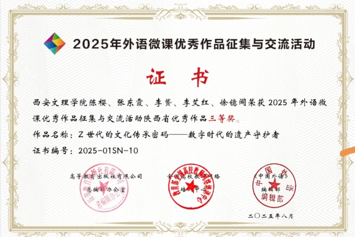 近日,由高等教育出版社、全国高校教师网络培训中心与《中国外语》编辑部联合主办的2025 年外语微课优秀作品征集与交流活动省级评审结果公布,外国语学院陈樱、张东霞、李赟、李艾红、徐镱闻组成的教师团队表现亮眼,其作品《Z 世代的文化传承密码— 数字时代的遗产守护者》荣获陕西省优秀作品三等奖。外国语学院高度重视此次活动,在前期准备中,教师团队围绕 “Z 世代与文化传承” 这一时代主题,深度融合数字技术与外语教学特性,...