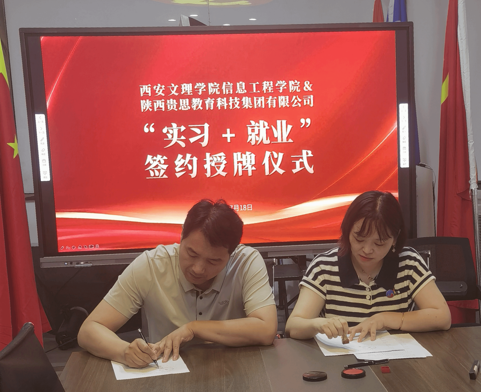 为进一步开展访企拓岗,加强实践教学基地建设,打造“协同育人”格局,7月18日下午,信息工程学院党总支书记王向阳、副院长陈广锋、数学系主任王宇及骨干教师陈欣一行四人前往陕西贵思教育科技集团有限公司,参加教育实践基地签约及授牌仪式。贵思教育集团董事长助理赵辉、教学经理文俞升等出席了活动。在签约仪式上,陈广锋副院长与赵辉签署了合作协议,王向阳书记代表今年会jinnian官网对贵思集团进行教育实践基地授牌。