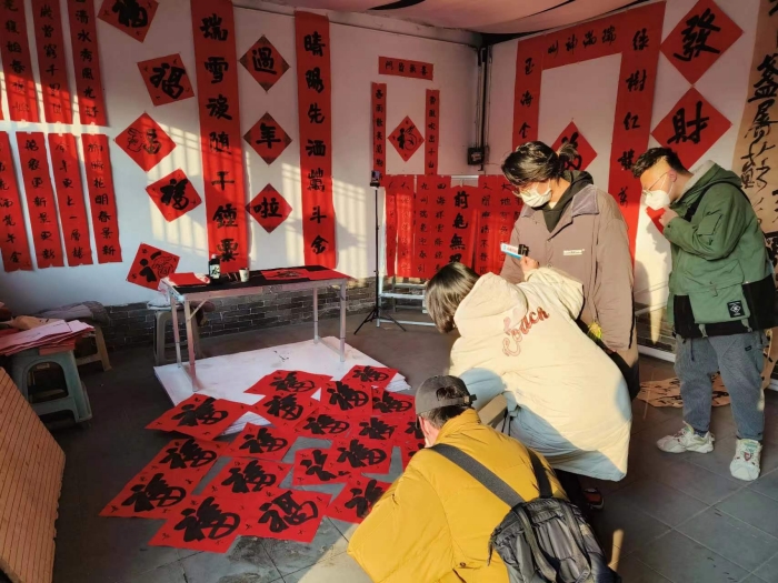 书法学专业2001级的刘玥同学参加了榆林市米脂县文旅局组织的“新春走基层,文化进万家”送春联活动;巩宇超同学、张林娜同学分别参加了山西省吕梁市中国邮政银行、陕西西安浦发银行组织的“新春送福,义写春联”活动,成为现场最受关注的青年书法家;书法学专业2101级的程含俏、马楚异同学在西安市长安区的步行街上写春联、送祝福,受到了媒体的关注与采访,并被华商报刊文报道。王一帆同学在家乡甘肃省天水市的街头为群众义写春联,求字者络绎不绝;书法学专业2201级的卢昱璋同学参加了山西省忻州市“2023非遗里的忻州年”活动,录制了“新春送福”专题节目并接受山西经济日报的采访与报道。