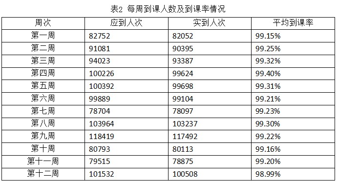 根据课程安排,应参加在线学习的学生9629人,其中第十二周应参加在线学习的学生101532人次,实际上课人数100508人次,平均到课率为98.99%。每周到课人数及到课率情况如表2所示。