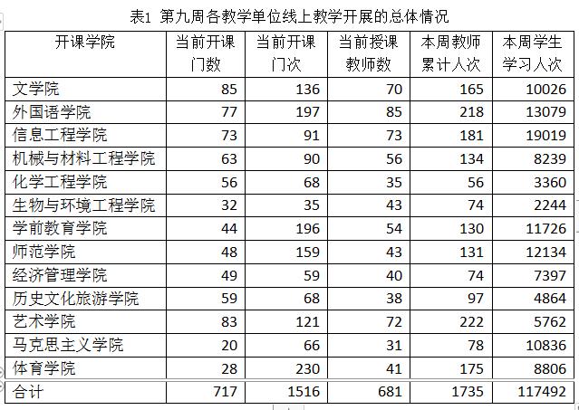 自2月24日以来,今年会2020年春季学期线上教学已开展九周。在校党委正确领导和广大师生共同努力下,新学期线上教学工作总体上运行平稳、有序进行。现将第九周的线上教学运行情况总结如下: