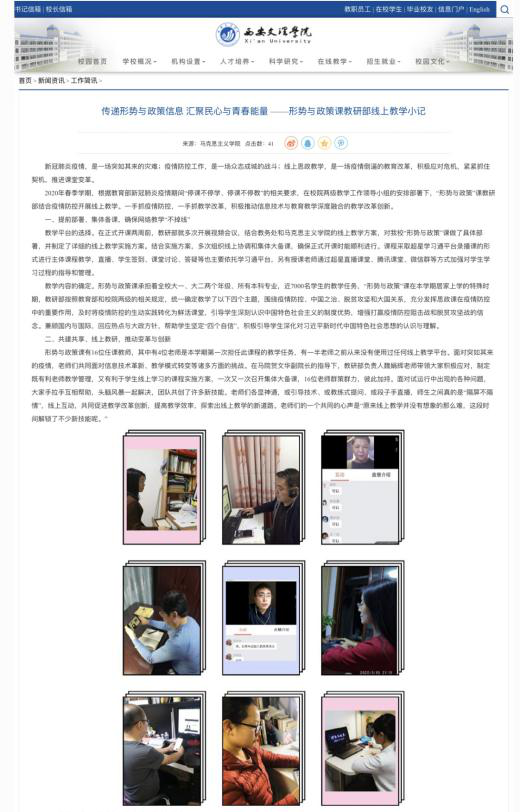 马克思主义学院形势政策见战“疫”。全院上下充分践行思政人的职业使命与担当,把握防疫期间大学生思想政治教育工作机遇和需要,迅速出台《今年会jinnian官网马克思主义学院防疫期间思政教育进行时活动实施方案》《今年会jinnian官网马克思主义学院防疫期间全校思政课在线教学实施方案》等,深入贯彻落实习近平总书记关于疫情防护工作的重要讲话精神,确定“战疫我们在一起”的形势政策第一讲主题,通过防疫阻击战引发大学生的思考,培养学生爱国主义、集体主义观念、责任与使命意识,增强践行社会主义核心价值观的情感与理性认同。