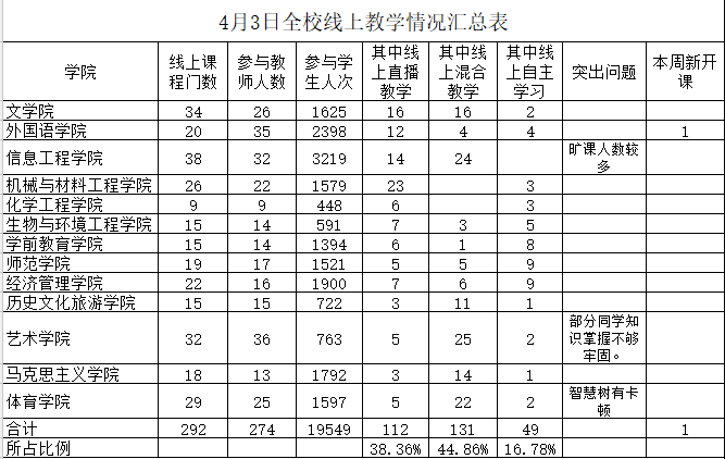 学校坚持“日统计—周汇报—月反馈”的常态化在线教学质量监控制度。各教学单位每日统计在线教学信息并上报教务处备案;教务处每周发布在线教学简报,各教学单位每周召集教学例会,交流线上教学经验,加强线上教学研判,及时总结经验;教务处每月根据问卷调查结果和校级教学督导听评课情况撰写并发布在线教学质量报告。学校在常态化监控基础上进一步加强在线教学质量监控与研判,4月初组织各二级学院总结在线教学阶段性工作,提炼经验、反思问题,梳理下一步改进工作思路。