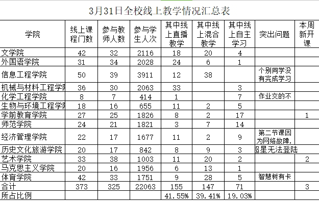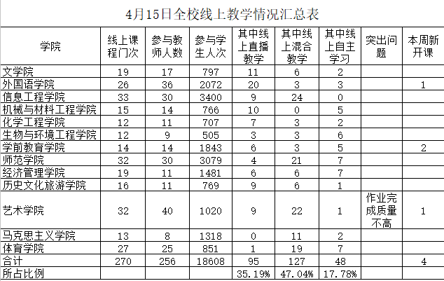 3月23日—4月30日,学校线上开课806门,共计1652门次。开课教师705名,累计授课8391人次,在线学习学生9629名,累计线上学习577725人次,平均到课率99.26%。