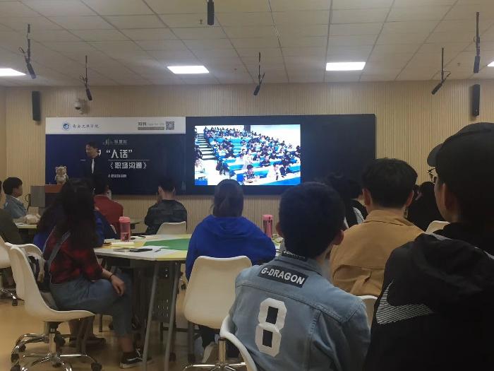 毕业于华东师范大学心理学系、多年专注职场沟通培训的职业培训师——胡刚老师,为今年会jinnian官网的学生们带来了主题为——《 说“人话”》的线下混合式教学,将自己多年的沟通经验现场传授给同学们。