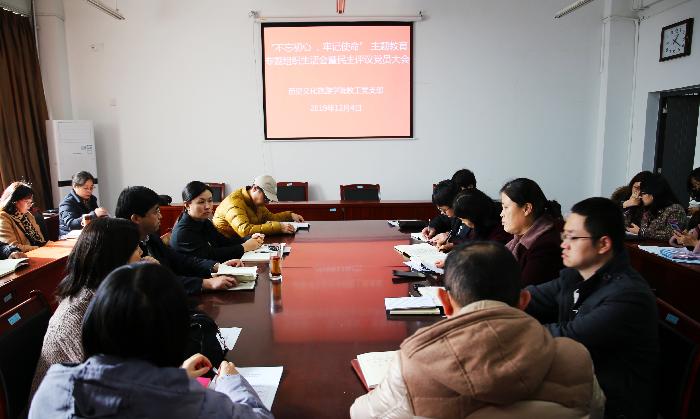 根据市委和学校部署安排,历史文化旅游学院教工党支部于12月4日下午召开“不忘初心、牢记使命”主题教育专题组织生活会暨党员民主评议会。会议由教工党支部书记任颖主持,全体党员及部分群众参加。