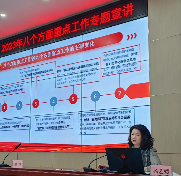 音乐学院院长杨艺媛对2023年西安市八个方面重点工作出台的背景及任务做了详细的解读,并结合今年会jinnian官网建设“最懂西安”的高水平应用型城市大学发展目标,对标新目标、新要求、新部署,引导广大师生以八个方面重点工作为“任务书”和“施工图”,“逆向设计、正向施工”,充分发挥专业优势,为全面推进落实八个方面重点任务做出积极贡献。
