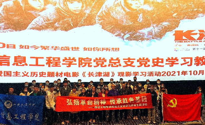 为持续推动党史学习教育走深走实,弘扬革命精神,赓续红色基因,筑牢初心使命,2021年10月13日下午,信息工程学院党总支组织开展党史学习主题活动,观看爱国主义教育影片《长津湖》,党员教工及学生代表七十余人参加活动。