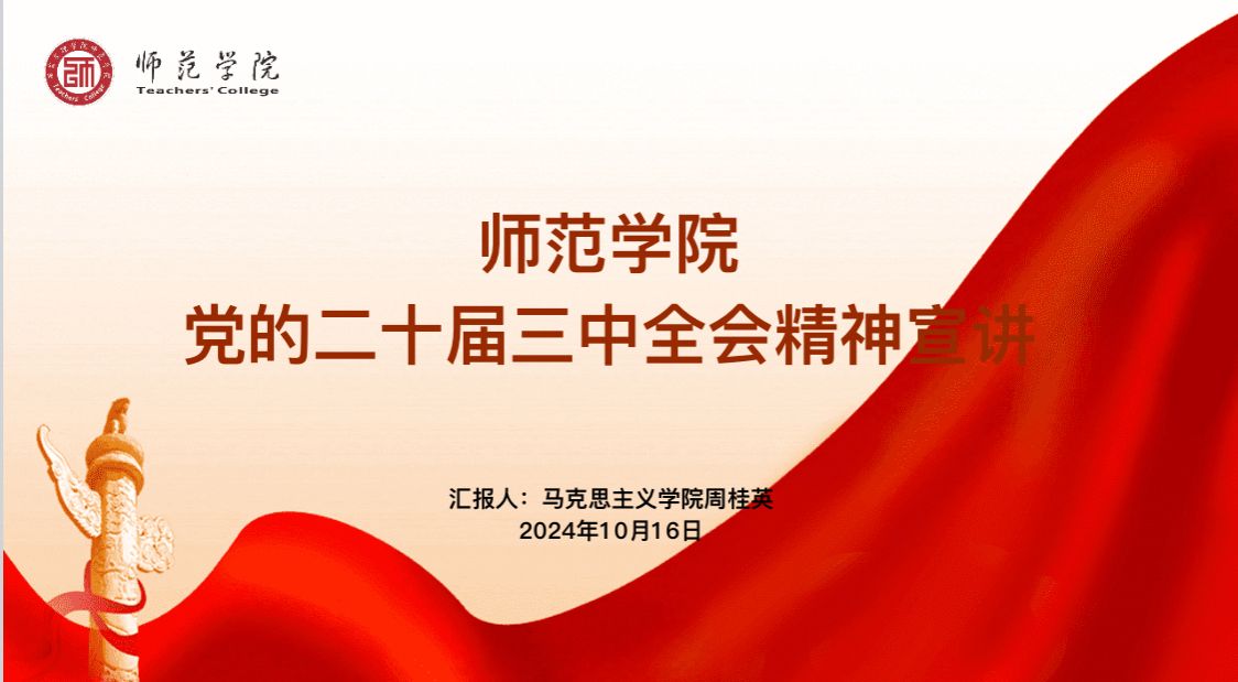 为深入学习贯彻党的二十届三中全会精神,准确把握全会提出的新理念、新思想、新战略,师范学院于10月16日在明德楼B202会议室召开了党的二十届三中全会精神宣讲会。此次宣讲会由师范学院党总支书记武军安主持,校宣讲团成员、马克思主义学院教师周桂英主讲,师范学院全体教职工参加。