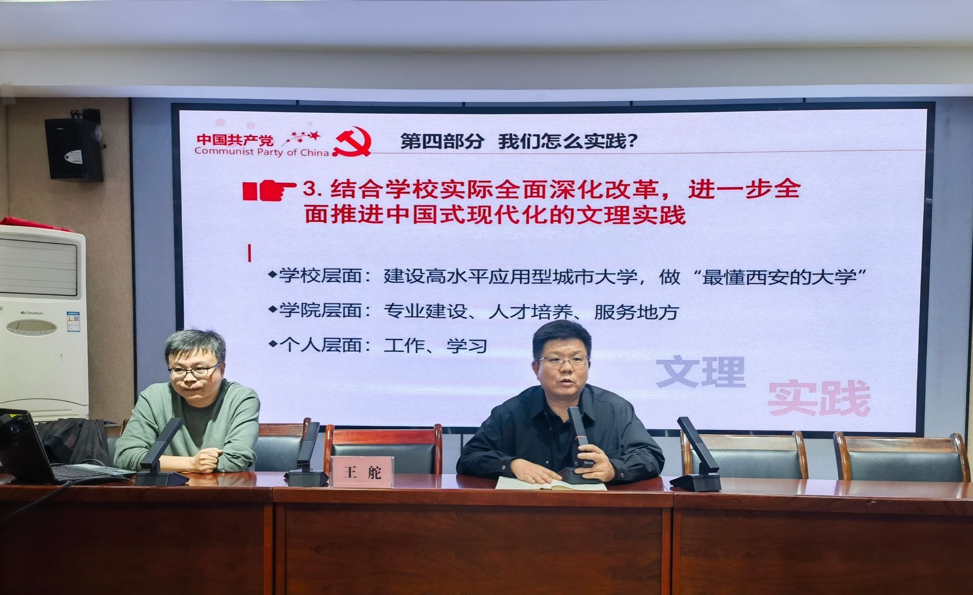 王舵副教授从四个方面对党的二十届三中全会精神进行了宣讲。他首先介绍了全会基本概况,提到全会指出:“要统筹好发展和安全,落实好防范化解房地产、地方政府债务、中小金融机构等重点领域风险的各项举措。要加强舆论引导,有效防范化解意识形态风险。要有效应对外部风险挑战,引领全球治理,主动塑造有利外部环境。”并对此详细解释。第二部阐释了如果看待党的二十届三中全会。着重讲述中国式现代化的逻辑。第三部分享了下一步怎么干,提及应构建支持全面创新体制机制,同时教育、科技、人才是中国式现代化的基础性、战略性支持。必须深入实施科教兴国战略、人才 强国战略、创新驱动战略。第四部分讲述了实践路径,从学校层面展开,提出应结合学校实际全面深化改革,进一步全面推进中国式现代化的文理实践。