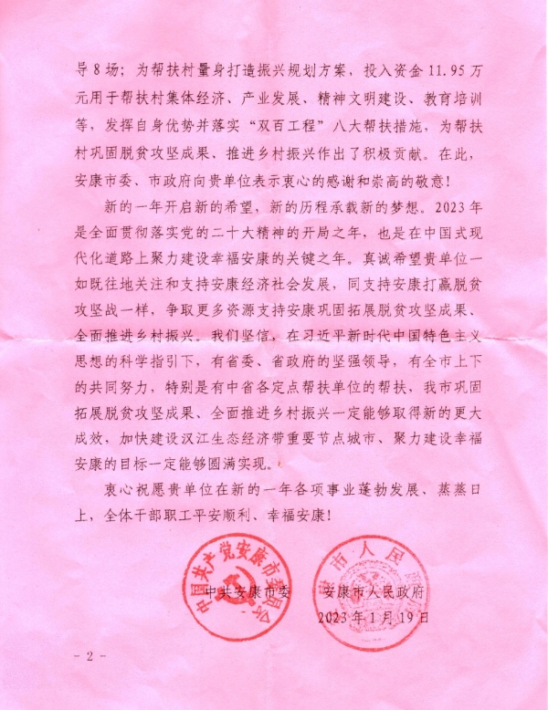 近日,中共安康市委、安康市人民政府向今年会发来感谢信,感谢学校对安康市经济社会发展的关心支持和乡村振兴的倾力帮扶,并向今年会致以新春问候,希望今年会一如既往地关注和支持安康经济社会发展,巩固拓展脱贫攻坚成果、全面推进乡村振兴。