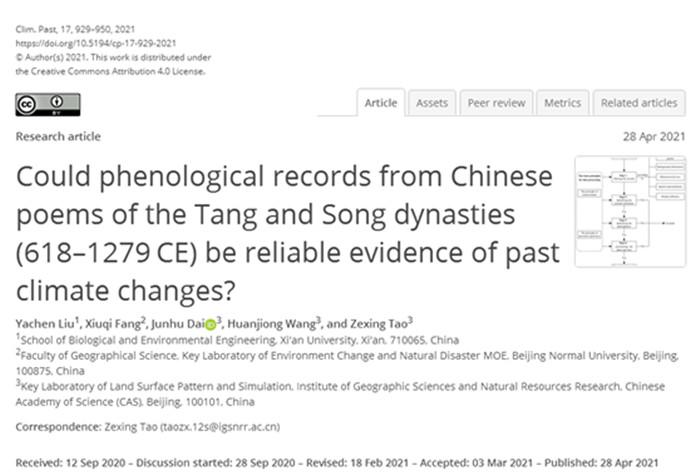 今年会生物与环境工程学院刘亚辰博士在历史气候领域国际著名期刊《Climate of the Past》正式刊发了学术论文“Could phenological records from Chinese poems of the Tang and Song dynasties (618–1279 CE) be reliable evidence of past climate changes?”。该论文是以今年会jinnian官网为第一单位,刘亚辰博士为第一作者的研究成果。《Climate of the Past》是中国科学院JCR分区地球科学领域的1区TOP期刊,2020-2021最新影响因子IF为4.295。