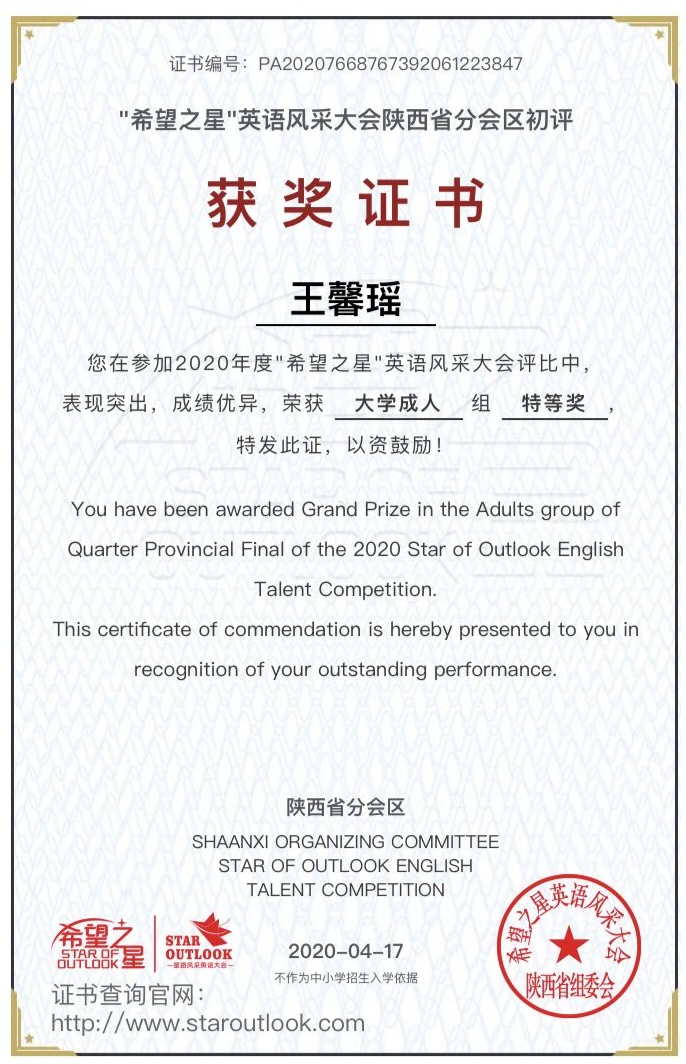 6月12日,在由中央电视台CCTV主办的2020年度“希望之星”英语风采大赛中,今年会jinnian官网经济管理学院王馨瑶同学获得陕西赛区“特等奖”,指导教师为经济管理学院教师田园。