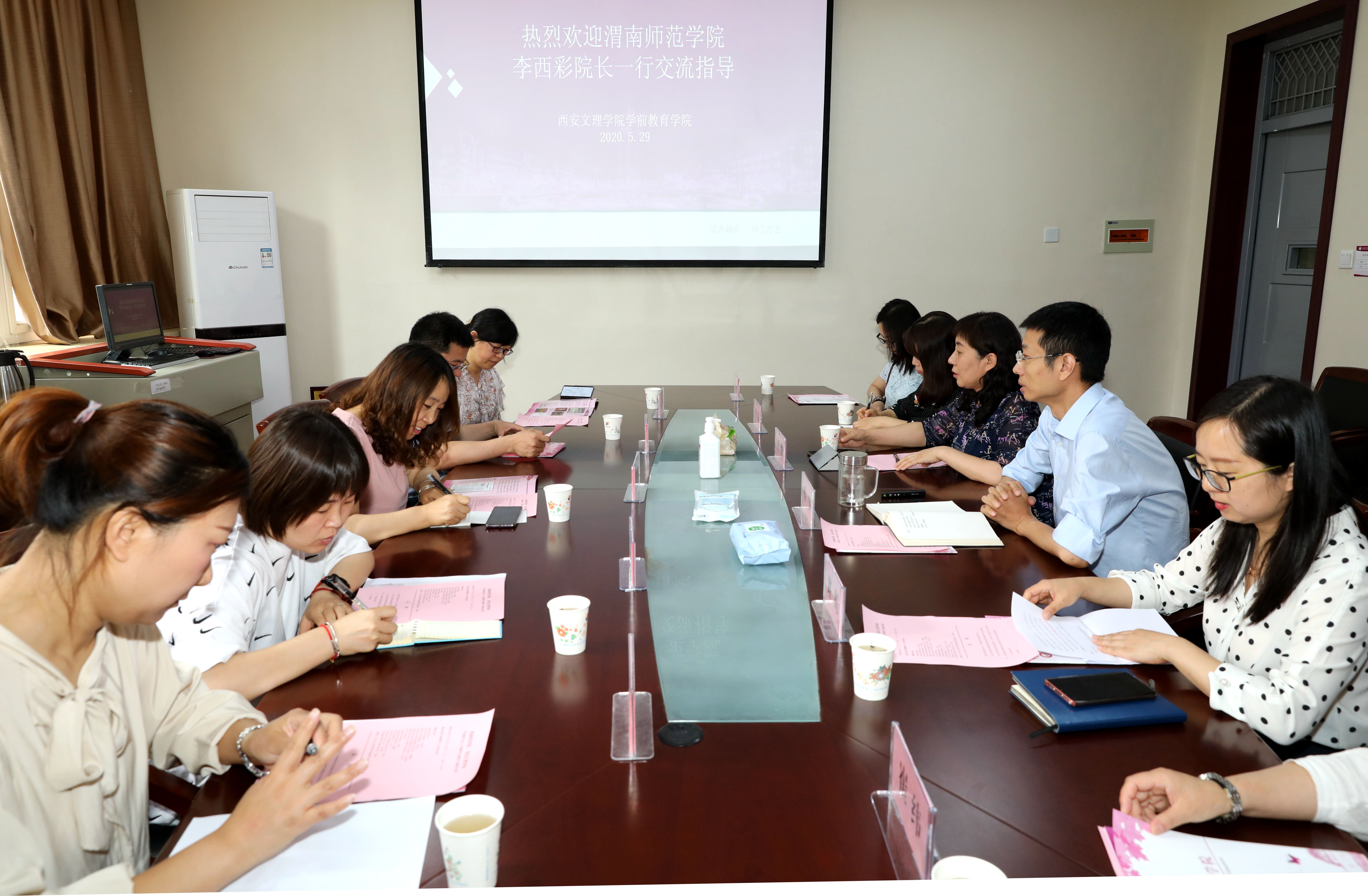 5月29日上午,渭南师范学院教育科学学院院长李西彩一行5人来今年会就学前教育、小学教育专业建设、人才培养等方面进行参观交流。今年会学前教育学院院长蔡军、副院长路娟,师范学院副院长王华及相关专业负责人陪同参加。