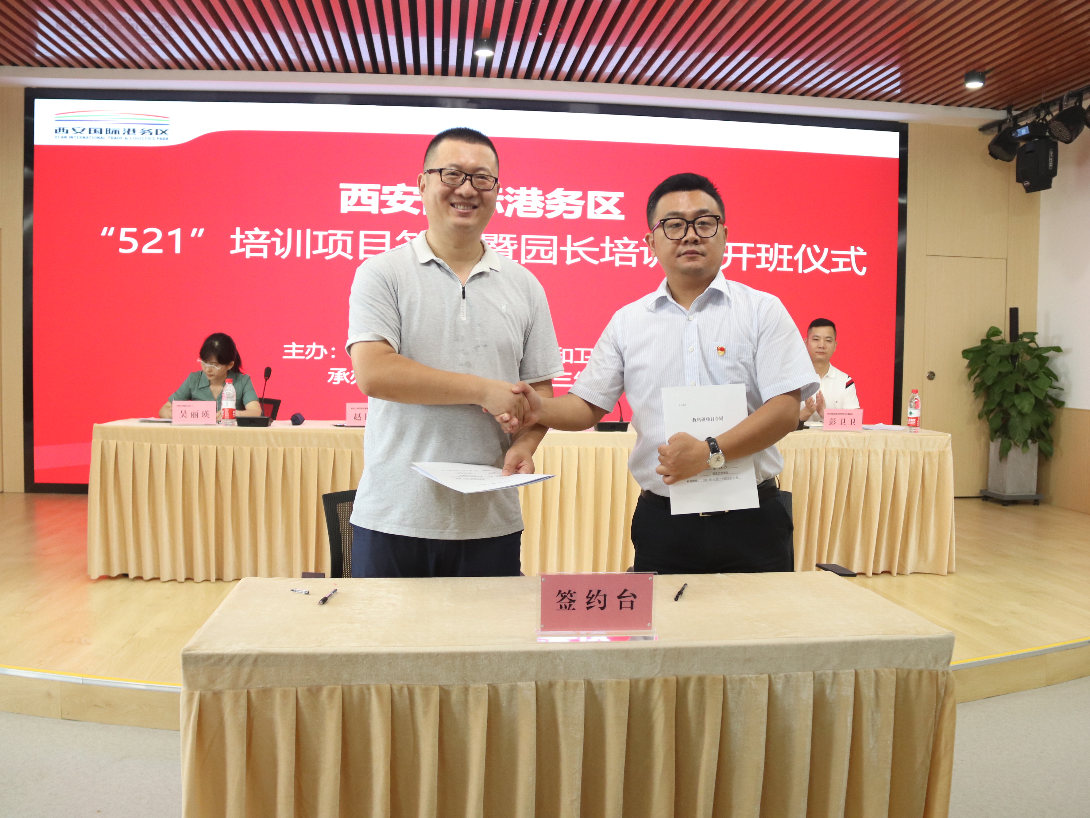 7月8日上午,在西安国际港务区陆港三幼,学前教育学院与西安国际港务区合作实施的学前教育“521”工程项目签约及园长班开班仪式隆重举行,西安国际港务区教育与卫生健康局副局长孙浩、学前教育学院副院长赵四鸿、西安高新文理幼儿园园长吴丽英以及参加培训的40余名港务区幼儿园园长参加了活动。