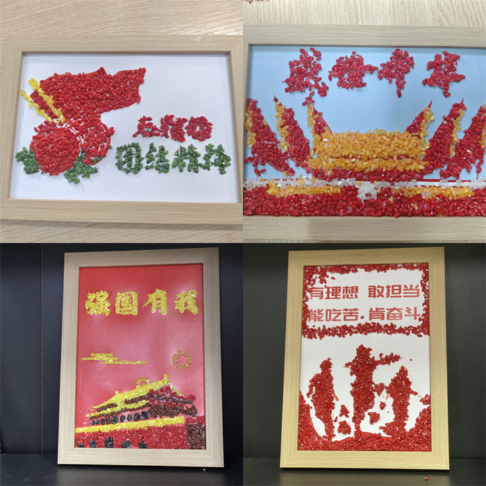 随后,大家通过粘、贴、压、拼五谷杂粮的方式,在纸板上进行创作。支部成员以五谷为笔画,以色彩作创意,献上《盛世中华》《石榴籽团结精神》《强国有我》《我和我的祖国》以及《有理想 有担当 能吃苦 肯奋斗》等精彩画卷,深情地表达对党的感恩之情和对祖国的美好祝愿。