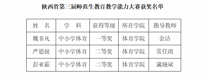 近日,省教育厅公布了第三届陕西省高等学校师范生教育教学能力大赛获奖名单。体育学院3名学生进入决赛,并取得一等奖1项、二等奖2项。