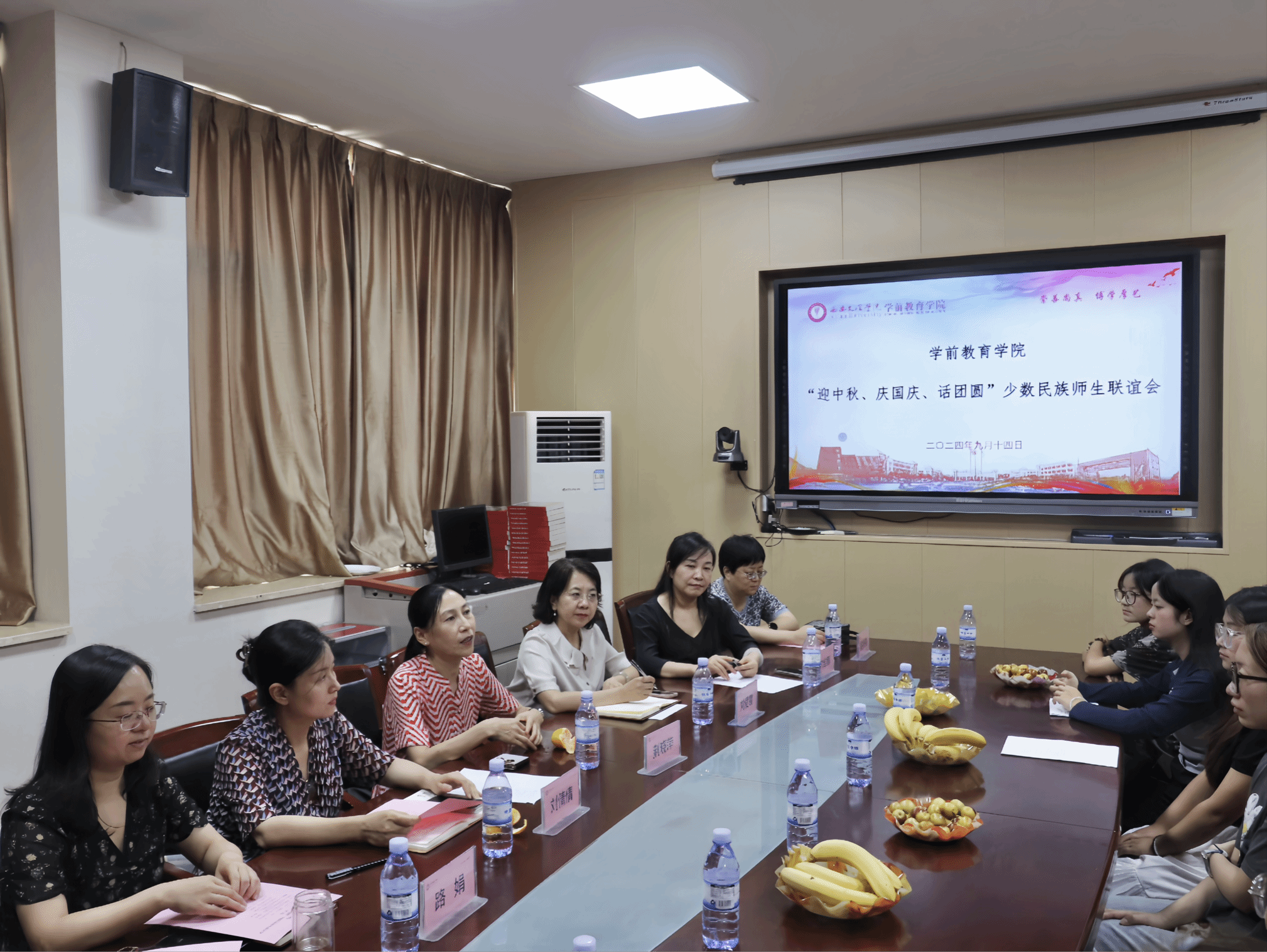 中秋国庆双节来临之际,学前教育学院于9月14日中午在弘文楼H0208举行了“迎中秋、庆国庆、话团圆”少数民族师生联谊会。校党委统战部常务副部长荆晓萍、党委学工部部长刘倩倩、学院党总支书记刘爱霞、科研副院长路娟、学院学工办全体辅导员及各年级少数民族学生代表参会。会议由学院党总支委员向维娜主持。