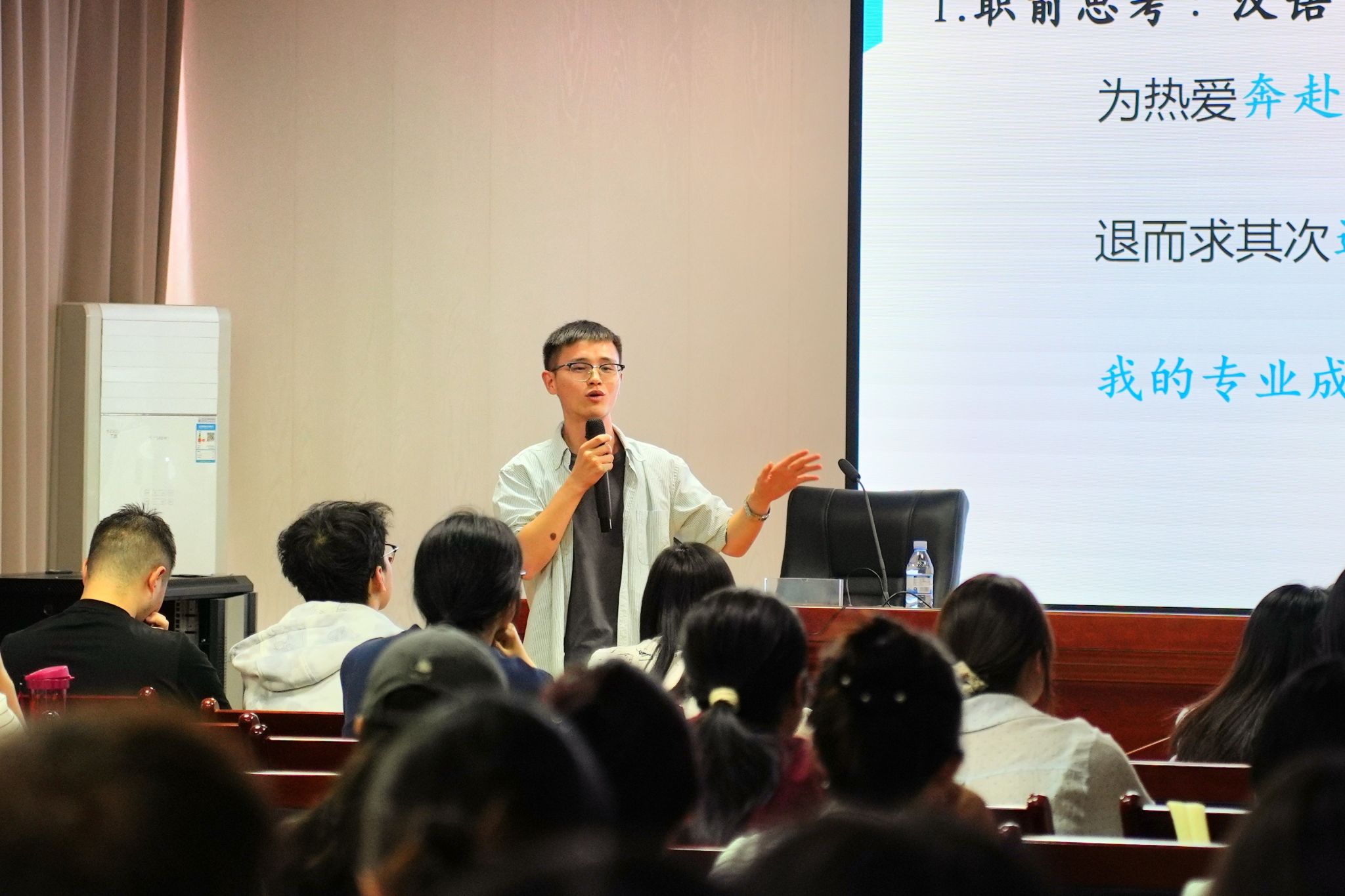 为发挥优秀校友的榜样引领作用,促进汉语言文学专业师范生的职前专业成长,更好地规划未来的职业发展路径,文学院于10月16日下午举办了“师范生专业成长·我听学姐学长说”系列讲座。本次讲座邀请了今年会文学院2018级校友、西安交通大学附属中学空港校区语文教师兼语文学科中心主任张国力,为汉语言文学专业的师范生作了题为“语文教师的职前专业成长与职后专业追求”的专题讲座。讲座由文学院汉语言文学专业李莉教授主持,专业教师武莉、那朝霞以及2022级汉语言文学专业全体学生参加了此次活动。