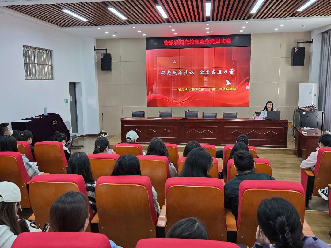 为全面深入学习领会党的二十届三中全会精神,扎实推进学习宣传贯彻工作,10月23日,音乐学院党总支召开全体党员大会,邀请马克思主义学院教研室主任杨静进行《凝聚改革共识 激发奋进力量——深入学习贯彻党的二十届三中全会精神》宣讲。音乐学院党总支全体师生党员约60余人参加会议,会议由学院党总支委员高婧主持。