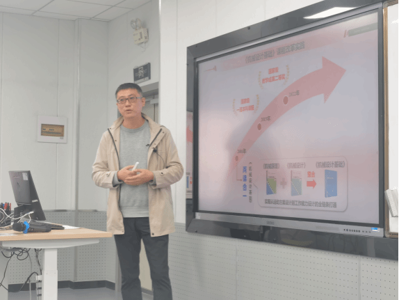 此次观摩活动中,李宝童教授首先介绍了《机械设计基础》这门课程教学改革的总体思路和作法,基于对学情的深入剖析,厘清了教学痛点;通过设计问题图谱、知识图谱、能力图谱,实现“三谱联动”,重构教学内容,优化教学资源,创新教学方法,营造真实情境,深化学习体验,构建起将知识、技能、实践融入工程思维主导的“思、研、产、赛”相融合的教学体系。