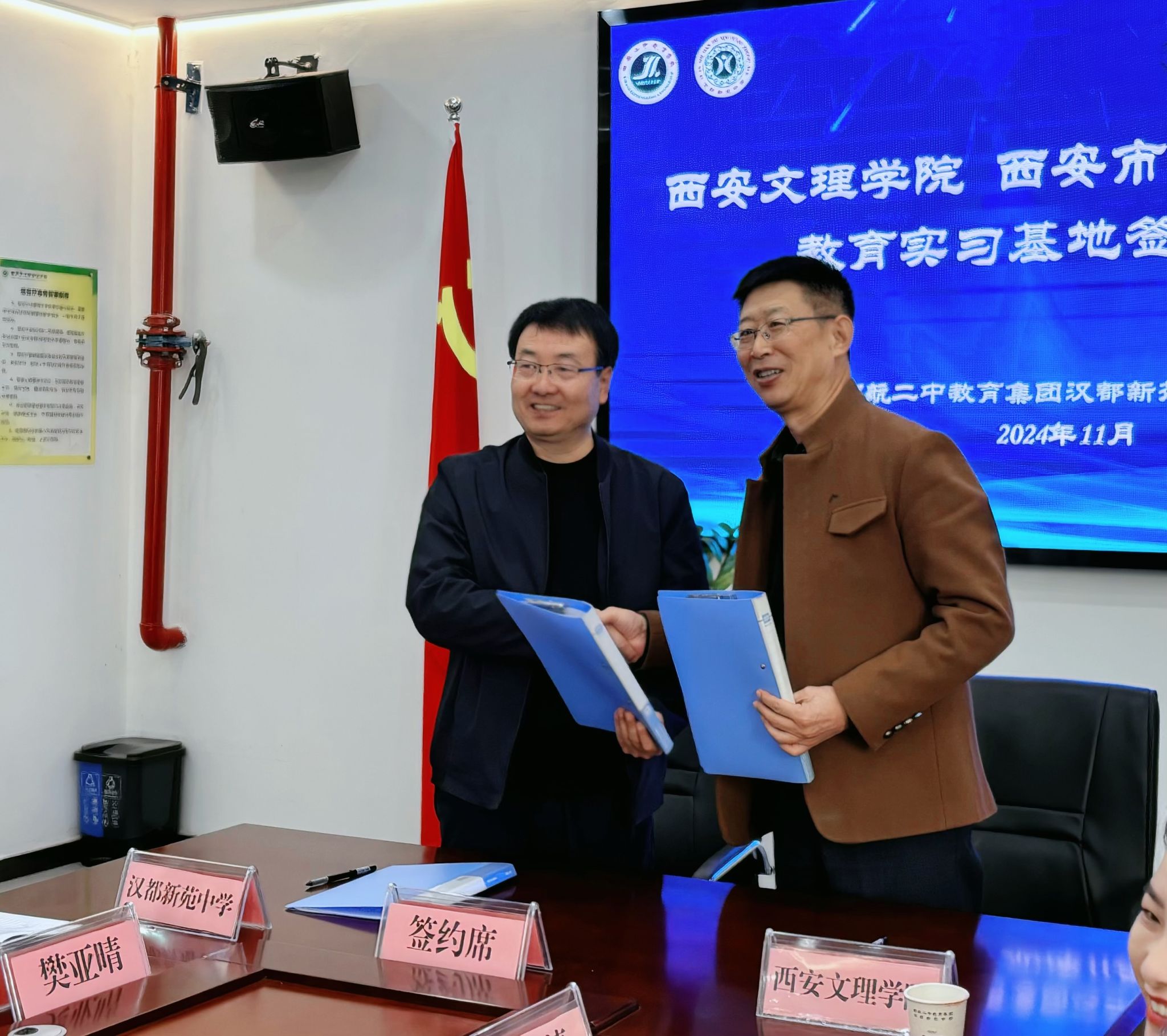 孙峰首先表达了对文学院一行的热烈欢迎,并介绍了汉都新苑中学的基本情况。孙峰表示汉语言文学专业实习生的到来、实习基地的签订、挂牌,都为汉都新苑中学的教育教学的进步发展打开了新局面。郝延军介绍了今年会“师范做优”“服务西安”的办学定位,文学院近年来坚持向西安各级中学大量输送人才,希望双方在实习的基础上进一步拓展全方位地合作交流,开展各类型的教学教研活动,坚持开放办学,服务基础教育,提升师范生技能增强提高。随后郝延军与孙峰签约教育实践地基协议,李莎莎为汉都新苑中学授予就业实习基地牌子。最后实习生代表贺宇佳、陈博扬发言表示,实习不仅磨练技能,也能增见识,真正实现知识到能力的迁移。
