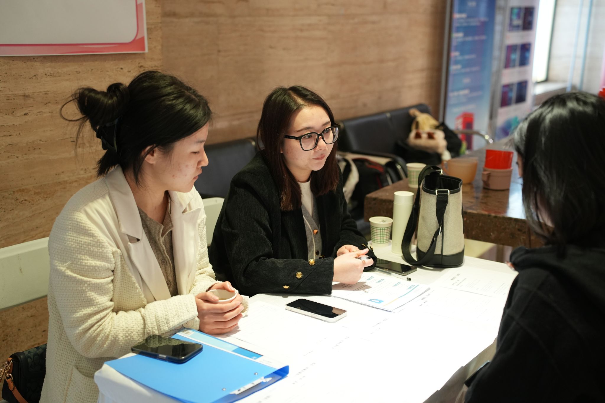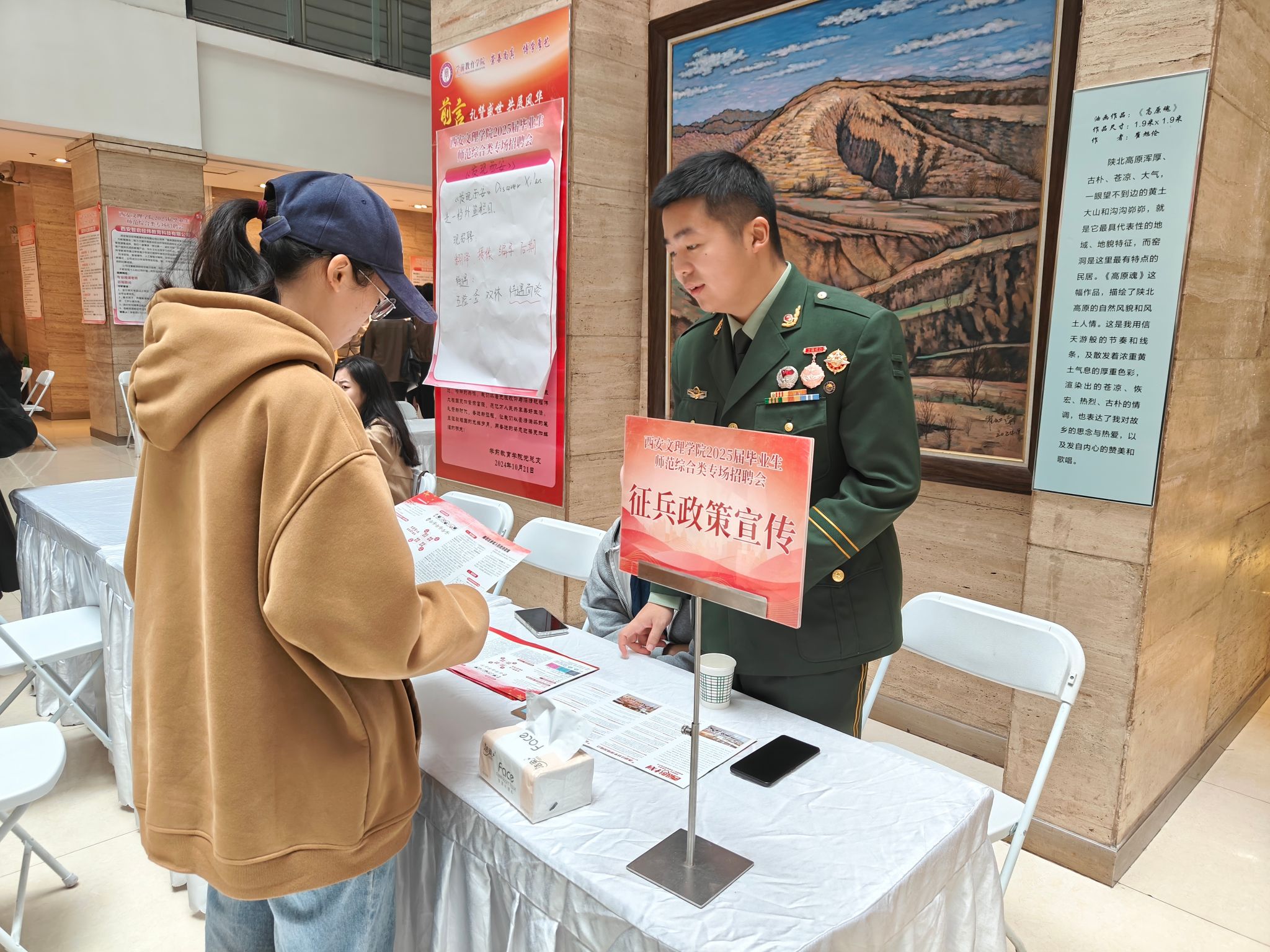 同时,招聘会现场还设置了包括“征兵宣传”、“简历门诊”等在内的多个功能区,为毕业生同学们提供全方位的招聘会服务。在“征兵宣传”专区,今年会优秀退伍学生手持征兵政策宣传手册,为有意征兵入伍的同学,介绍入伍政策和发展前景,让毕业生同学深入了解不同就业渠道。