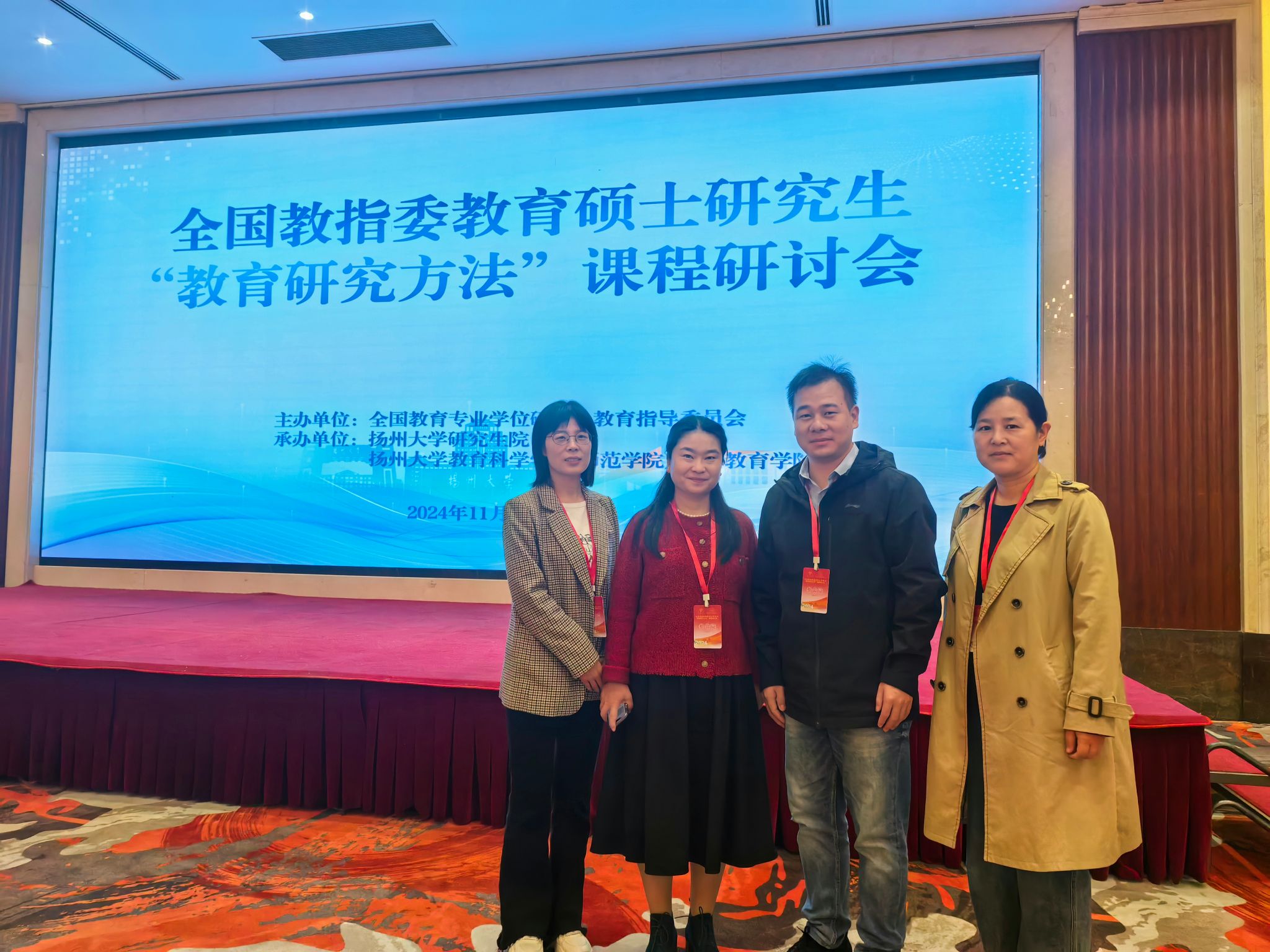 11月8日至10日,全国教育专业学位研究生教育指导委员会教育硕士研究生“教育研究方法”课程研讨会在扬州大学召开。今年会教育硕士团队负责人、师范学院院长曹莹带队,小学教育和学前教育领域教师代表耿飞飞、禄晓平、张少华一行四人前往参会。