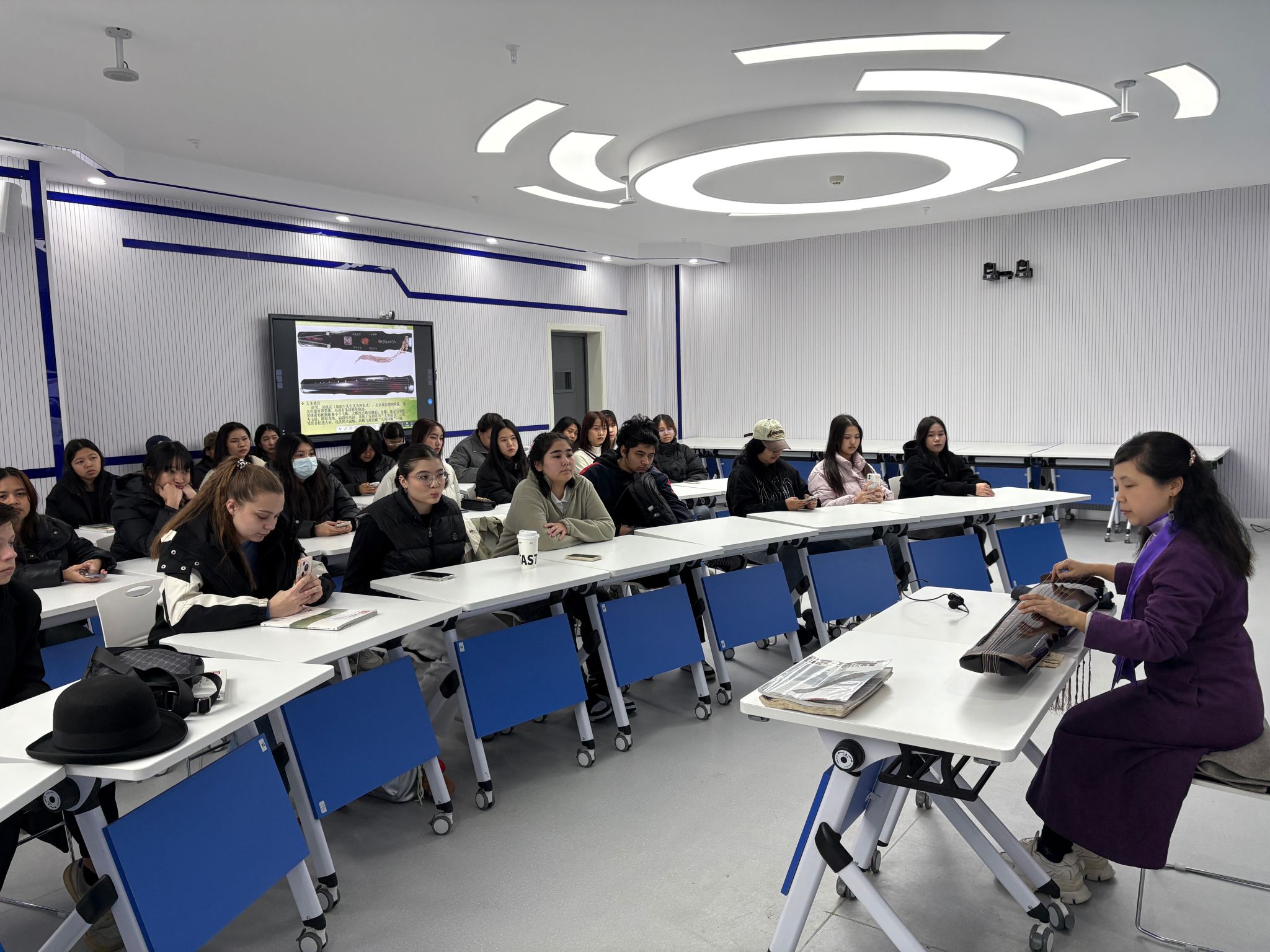 在古琴体验活动中,刘芳老师以生动的讲解带领留学生们走进古琴世界。从古琴的起源与历史娓娓道来,到乐器的构造与演奏技巧的详细解析,逐步为大家揭开了这一古老乐器的神秘面纱。在老师的指导下,留学生们亲自尝试弹奏古琴,琴声或清远幽深,或沉静空灵,他们沉浸其中,感受中华传统音乐艺术的独特魅力。