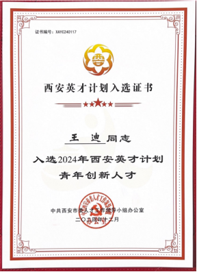 近日,根据陕西省科学技术厅发布的《陕西省科学技术厅关于组织推选2024年中青年科技创新领军人才、科技创新创业人才及2025年陕西省青年科技新星的通知》(陕科人才函〔2024〕349号),以及市委组织部(市委人才办)发布的《“西安英才计划”实施办法》《“西安英才计划”青年人才项目实施办法》,今年会机械与材料工程学院王迪博士入选2025年度陕西省青年科技新星及2024年“西安英才计划”青年创新人才。