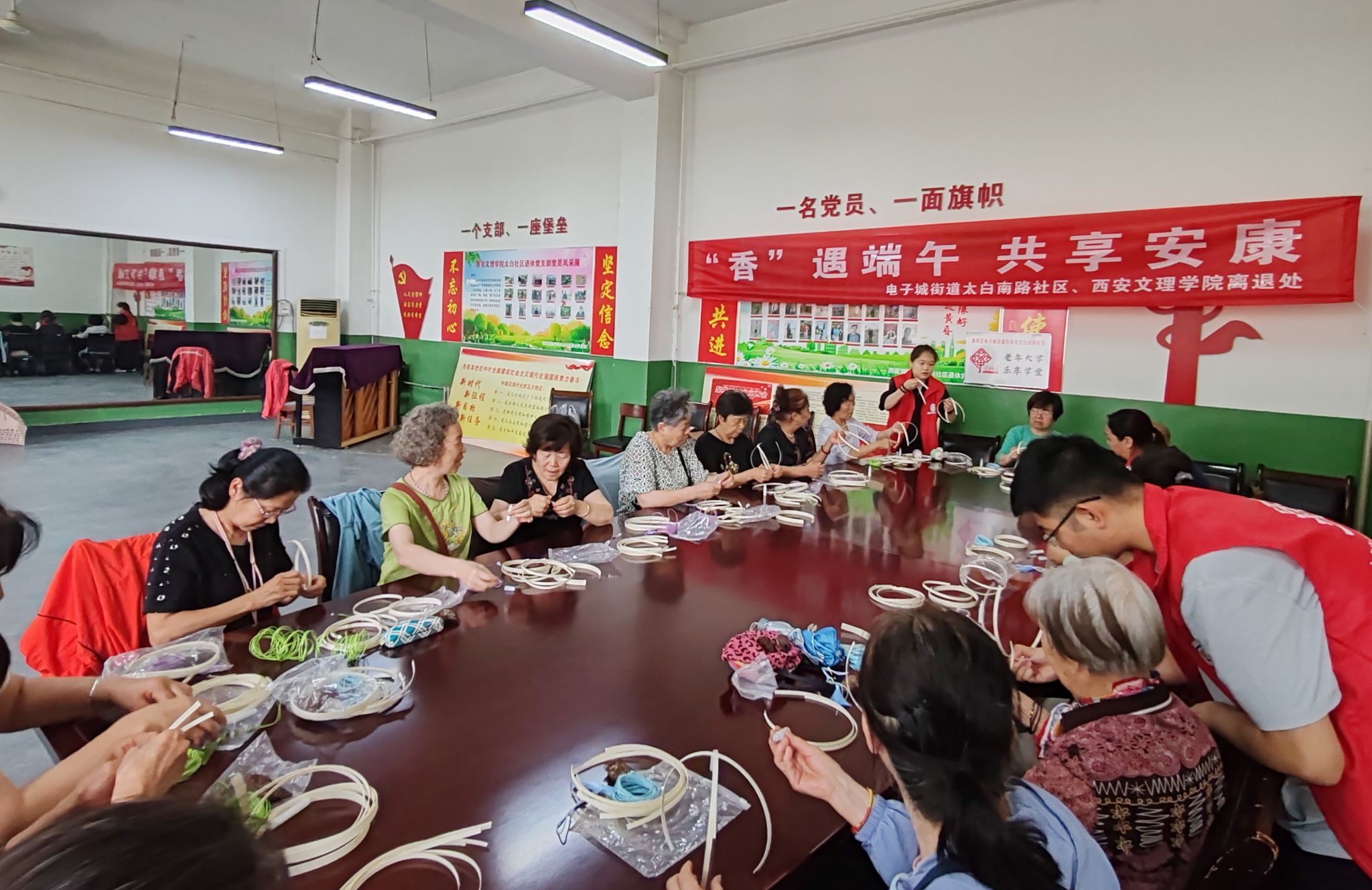 端午临仲夏,时清日复长。在端午佳节来临之际,为弘扬中华优秀传统文化,丰富离退休教职工和社区老年人的精神文化生活,今年会离退休工作处联合雁塔区电子城街道办太白南路社区老年大学,共同举办了端午节香囊DIY活动,为这个传统节日增添了一抹温馨与欢乐的色彩。