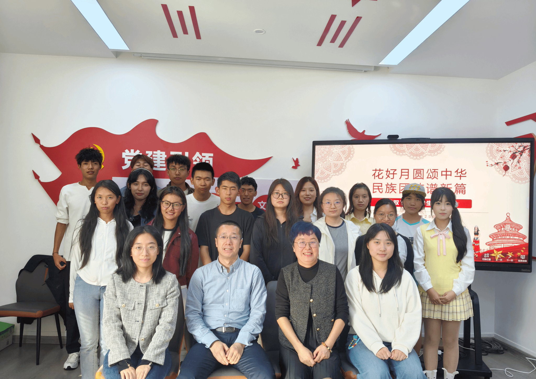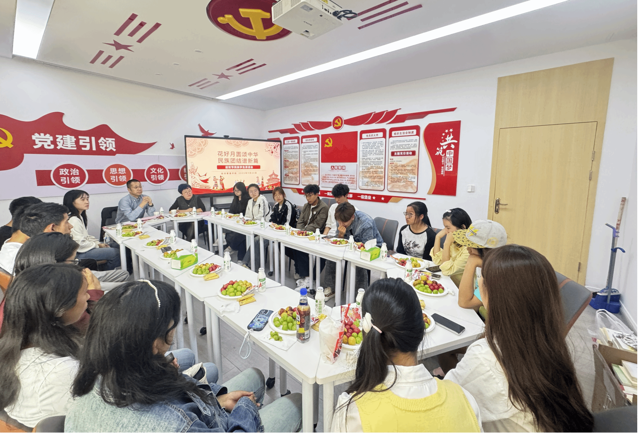 为铸牢中华民族共同体意识,9月24日下午,经济管理学院在东铭二号“一站式学生社区”党员活动室,举办“花好月圆颂中华,民族团结谱新篇”民族学生茶话会。学院党总支书记陈沛、学工办主任胡欣、辅导员与藏族、回族、满族等 20 余名民族学生代表齐聚,共庆中秋、国庆双节。