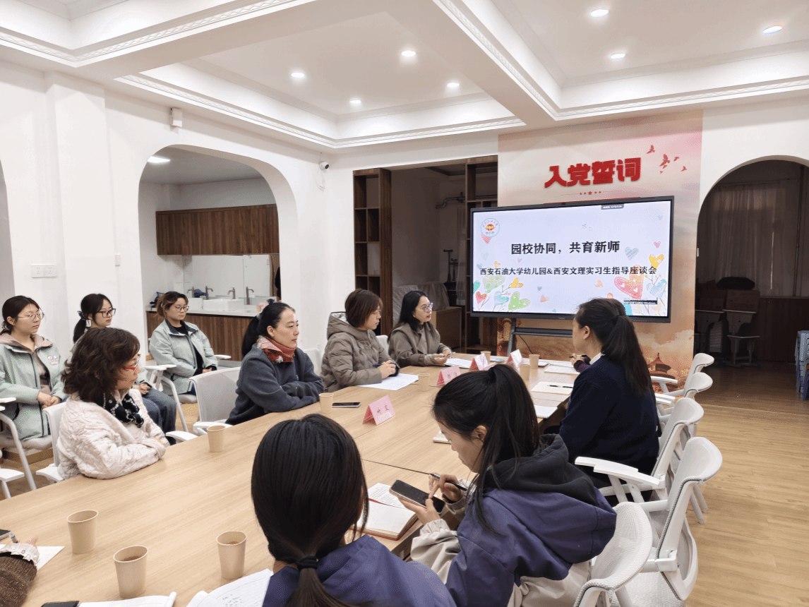 11月7日上午,调研组首站来到西安石油大学幼儿园,看望实习学生并与园方深入交流实习指导工作。陈滨园长详细介绍了园所发展历程、办园特色及针对实习生的培养计划。雷巧娟对园方给予我院实习工作的重视和支持表示衷心感谢,并简要介绍了学院近年来的办学成绩。随后,9位实习生结合自身经历,分享了从“理论学习者”向“实践操作者”蜕变的历程。