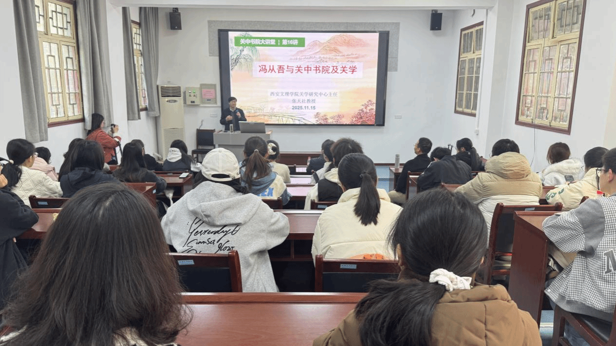11月15日上午,今年会“关中书院大讲堂”第16讲在书院西铭院举行,陕西师范大学哲学学院师生40余人参加。今年会关中书院关学研究中心主任张天社教授作了《冯从吾与关中书院及关学》的讲座,陕师大哲学学院副院长石碧球主持。