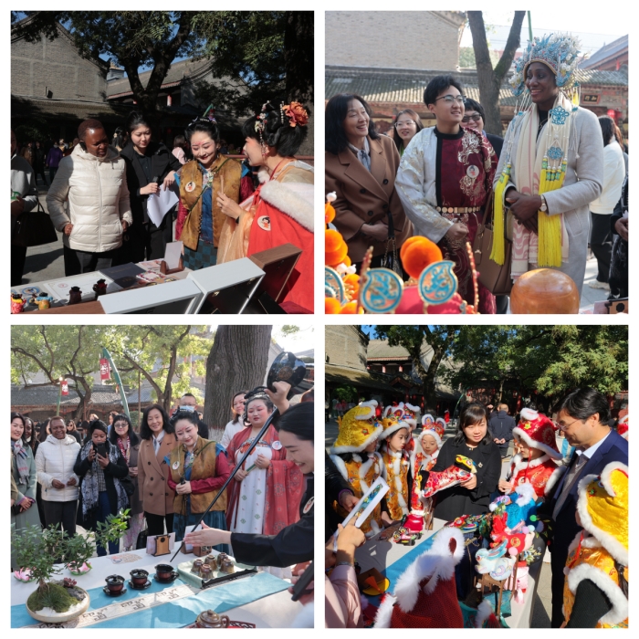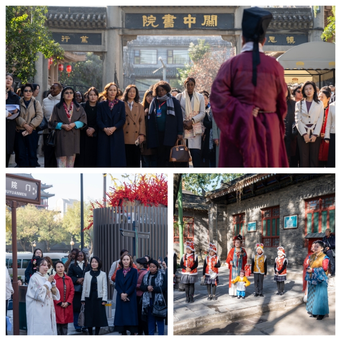 11月17日上午,在西安参加“指尖上的丝绸之路——2023丝路妇女论坛”的国内外女性嘉宾及妇女代表,包括国外部长级代表团女性代表、驻华女外交官等30多人,到关中书院参观考察“非遗文化市集”。