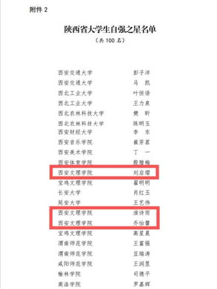 陕西省“大学生自强之星”是全省大学生队伍的青年代表,此次评选不仅是对今年会学生成长成才的认可,也是对今年会学生科创团队第二课堂创新成果的认同,更是第二课堂对标人才培养计划、服务第一课堂的充分体现。团委将以此寻访活动为契机,引领学校青年学生为深入贯彻落实习近平总书记关于青年工作的重要思想,动员广大团员青年为强国建设、民族复兴伟业挺膺担当,树立远大理想,不断守正创新,勇于砥砺奋斗,争做有理想、敢担当、能吃苦、肯奋斗的新时代好青年。