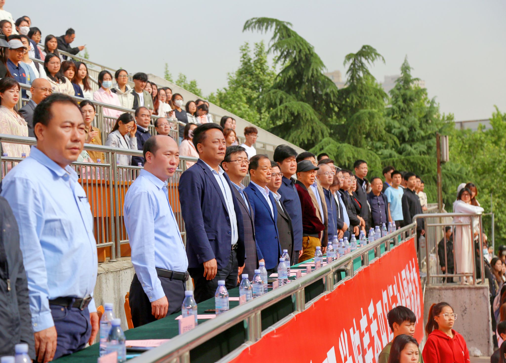 运动员方阵就位后,举行了庄严的升国旗仪式,在场师生齐声高唱中华人民共和国国歌。