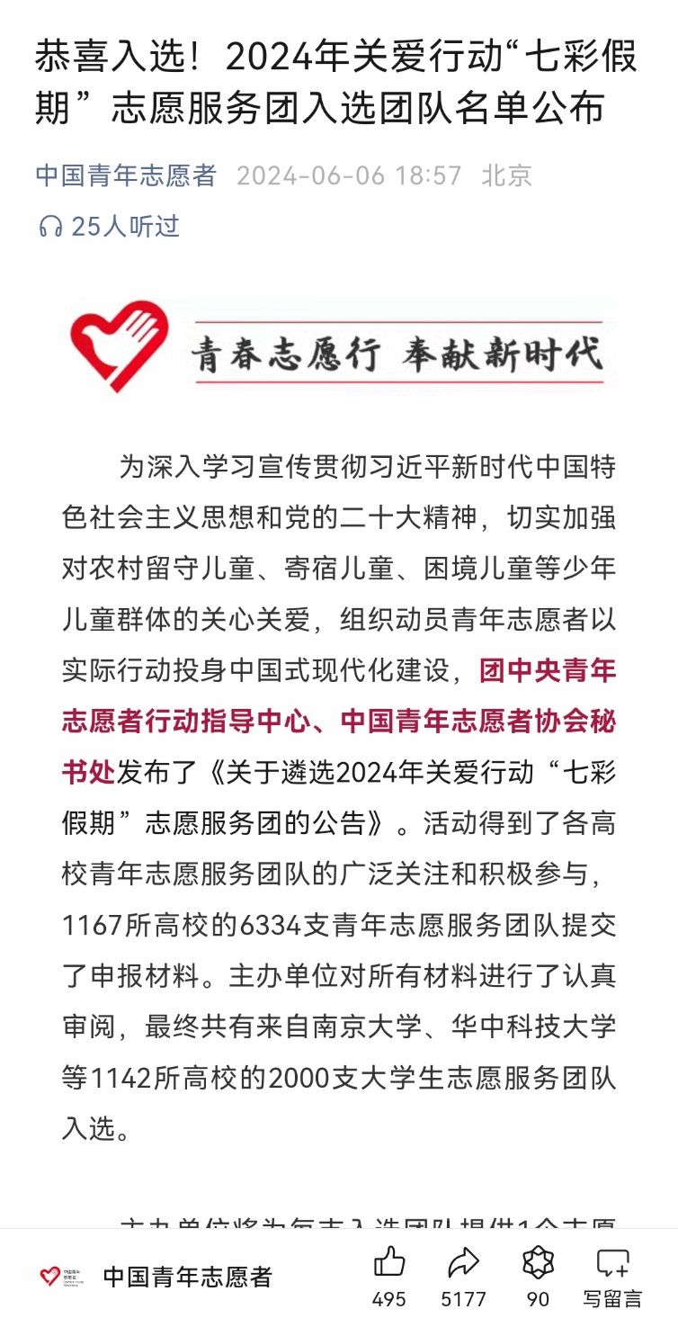 近日,团中央青年志愿者行动指导中心、中国青年志愿者协会秘书处发布了《关于遴选2024年关爱行动“七彩假期”志愿服务团的公告》,来自1167所高校的6334支青年志愿服务团队申报,今年会机械与材料工程学院“微光筑梦”爱心支教团成功入选!