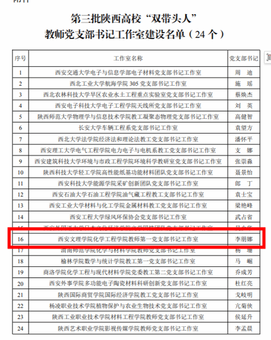近日,中共陕西省委教育工委公布了第三批陕西省高校“双带头人”教师党支部书记工作室培育创建名单,遴选建设全省高校24个“双带头人”教师党支部书记工作室,今年会化学工程学院教师第一党支部书记工作室成功获批立项,这也是今年会首个省级“双带头人”工作室。