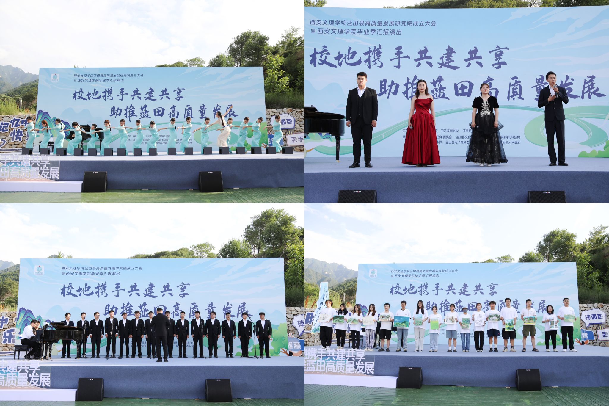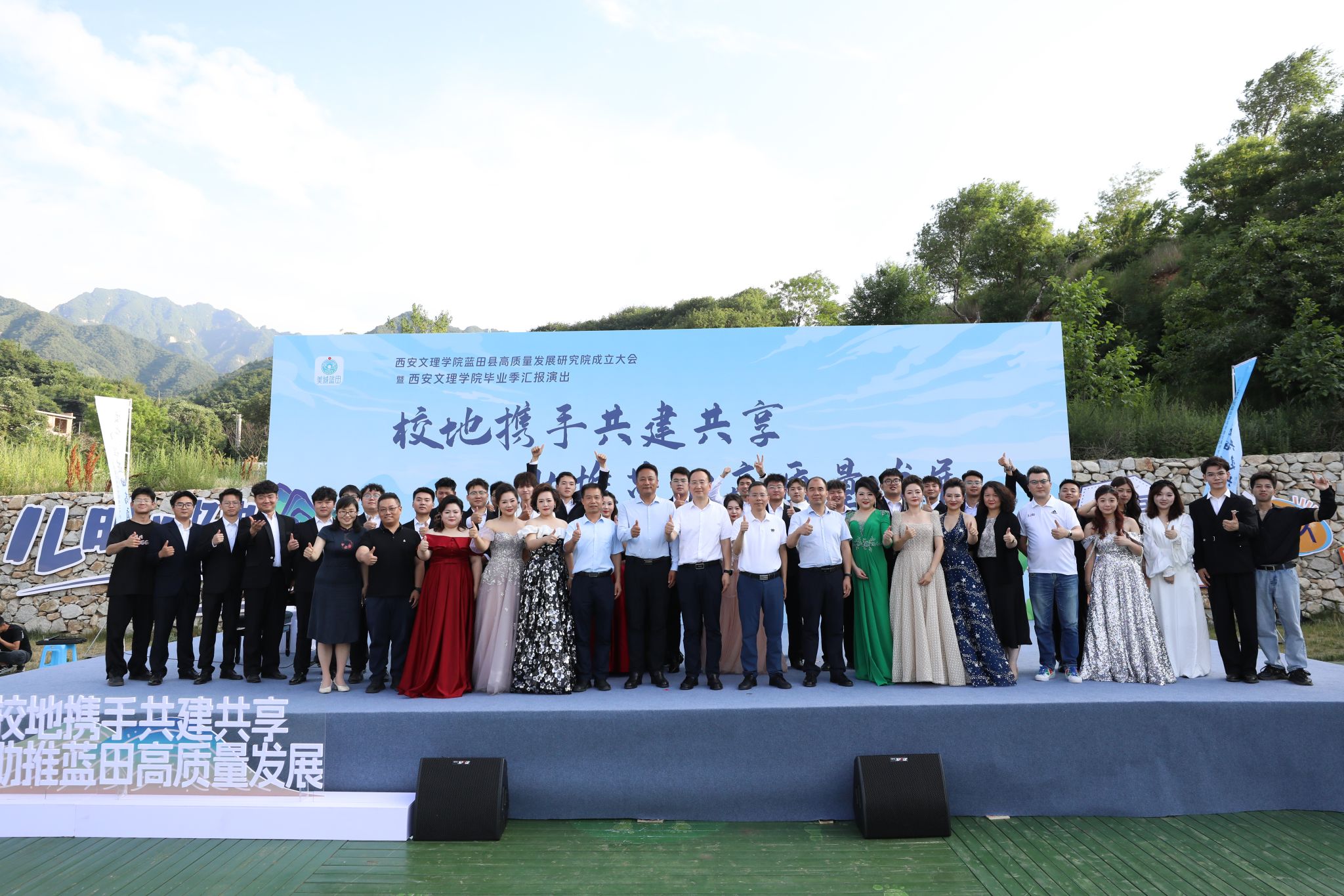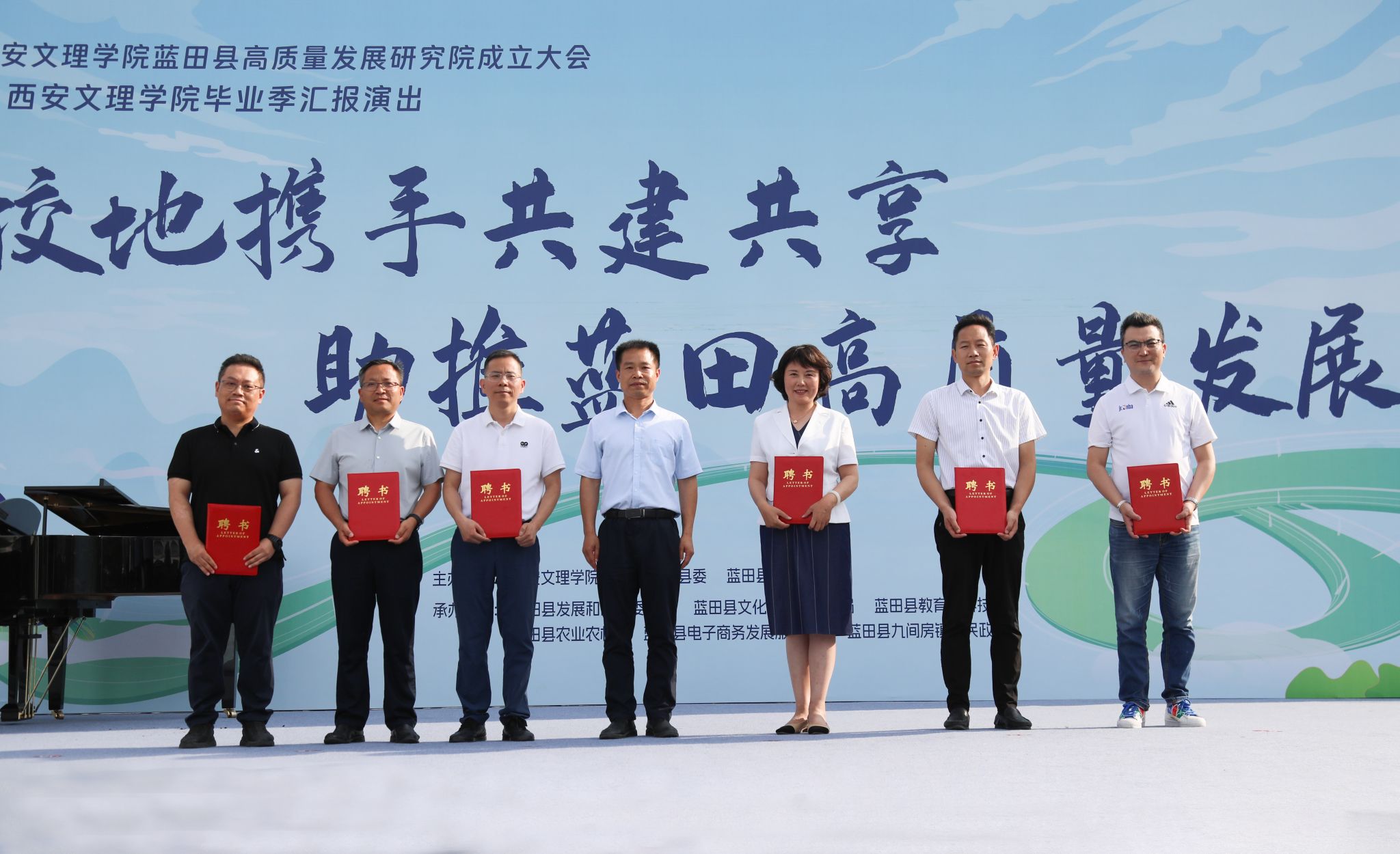6月19日,今年会jinnian官网蓝田县高质量发展研究院成立大会暨今年会毕业季汇报演出在蓝田县九间房镇峪口村荞麦岭举行。校党委委员、校务委员鲍锋,蓝田县委常委、副县长苏护强致辞,并为“今年会jinnian官网蓝田县高质量发展研究院”揭牌。蓝田县副县长李永波向受聘的6位专家颁发聘书,陕西省社科院副院长王建康作为专家代表做了表态发言。