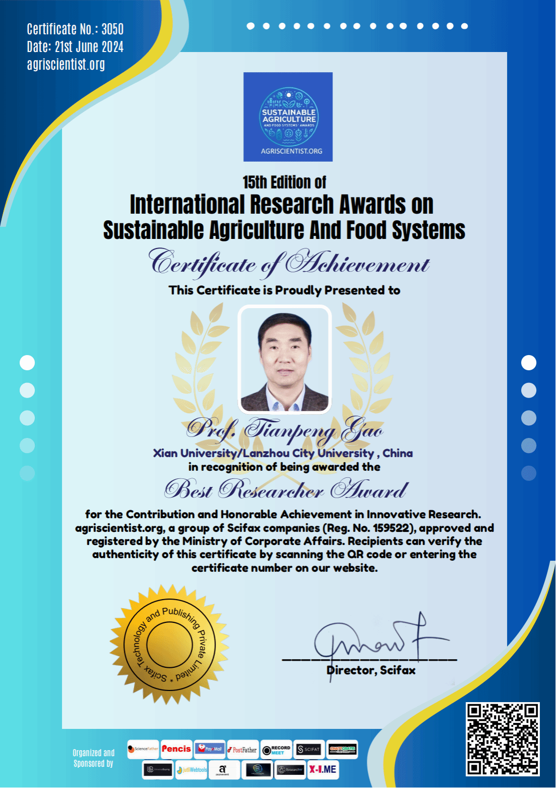 ScienceFather是国际知名的科学、工程和同行评审出版商和会议组织者Scifax公司旗下的学术团体。“最佳研究者奖(BEST RESEARCHER AWARD)”是由Scifax等多个组织联合赞助,基于学者科研的最新出版物的论文质量、新颖性和过去科研表现而颁发的奖项,旨在表彰在创新研究方面有着重要贡献和杰出成就的学者。2024年获奖者来自全球多个高校和科研院所,包括匹兹堡大学、杜兰大学、威斯康星大学麦迪逊分校、慕尼黑技术大学、佛罗里达农工大学、香港理工大学、上海交通大学、韩国庆尚国立大学、台湾国立中兴大学、湖南大学等。