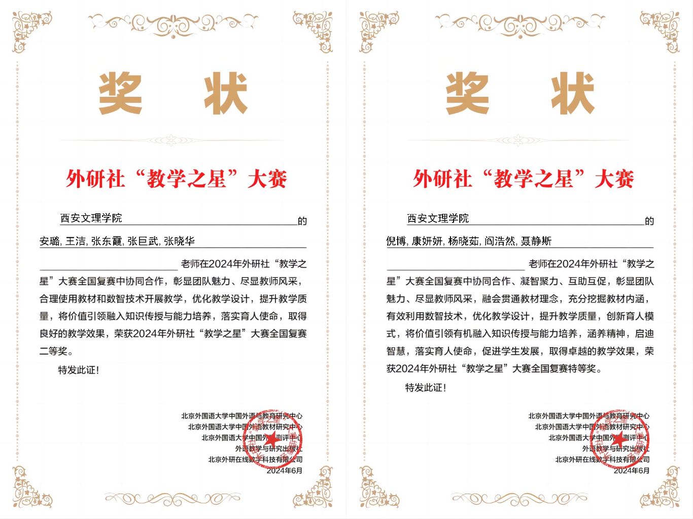 6月20日,由北京外国语大学中国外语与教育研究中心、外语教学与研究出版社主办的2024外研社 “教学之星”大赛(本科英语组)全国半决赛晋级名单公布。今年会外国语学院英语类专业组团队(倪博、康妍妍、杨晓茹、阎浩然、聂静斯)荣获全国复赛特等奖,并作为陕西唯一的英语类专业组代表队晋级全国半决赛,实现了今年会在该赛事上零的突破;同时,大学英语组团队(安璐、王洁、张东霞、张巨武、张晓华)荣获全国复赛二等奖。