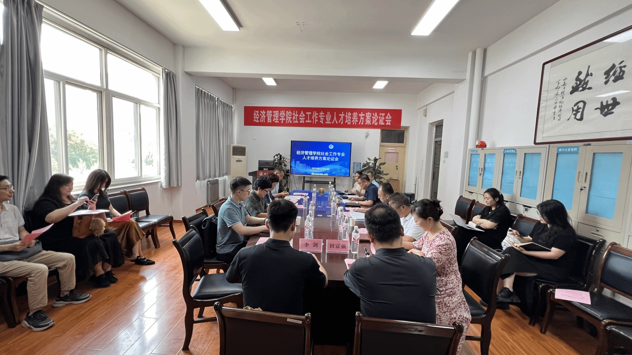 7月4日下午,经济管理学院召开社会工作专业人才培养方案论证会。特邀中国社会工作教育协会副秘书长、陕西省社会工作协会会长、西北大学慈善研究院副院长刘莹教授;长春理工大学社会工作国家一流专业负责人、硕士生导师杜实博士;西安市委社会工作部六处处长马蓉、干部李磊、李剑到会指导。教务处副处长付洪冰博士,经济管理学院院长闫荣国教授、党总支副书记朱芳芳、副院长兼社会工作专业负责人贺志武副教授以及社会工作专业教师等17人参加。今年会校务委员徐东升出席。
