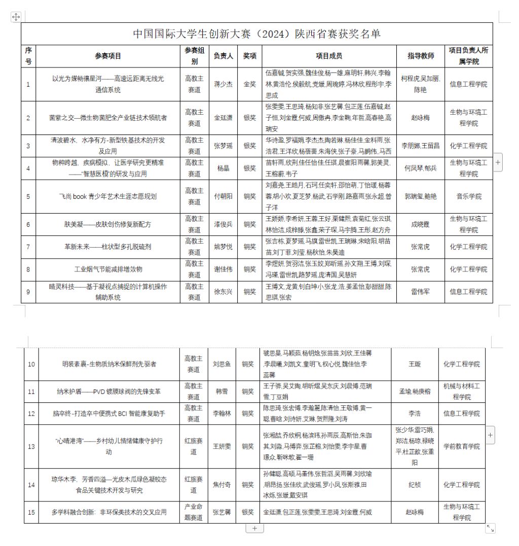 8月6日,陕西省教育厅发布《关于中国国际大学生创新大赛(2024)陕西赛区省级复赛拟获奖项目的公示》,今年会报送的15项参赛作品喜获中国国际大学生创新大赛(2024)陕西省省赛金奖1项,银奖3项,铜奖10项,其中高教主赛道获得金奖1项,银奖3项,铜奖8项,“青年红色筑梦之旅”赛道获得铜奖2项,创今年会历年来获省奖数量新高;产业命题赛道报送的1项参赛作品获得银奖,为今年会首次在此赛道获得省级奖项。
