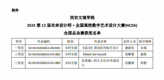 惠嘉欣同学创作、东瑞老师指导的《延安》原创宣传短片设计作品荣获全国总决赛一等奖,由梁馨蕾同学创作、康凯老师指导的《Meet the future》作品和范馨雅同学创作、周雅老师指导的《孙思邈-药王文化IP形象设计》作品获得三等奖,作品展现了学子们在数字艺术领域的才华和实力。