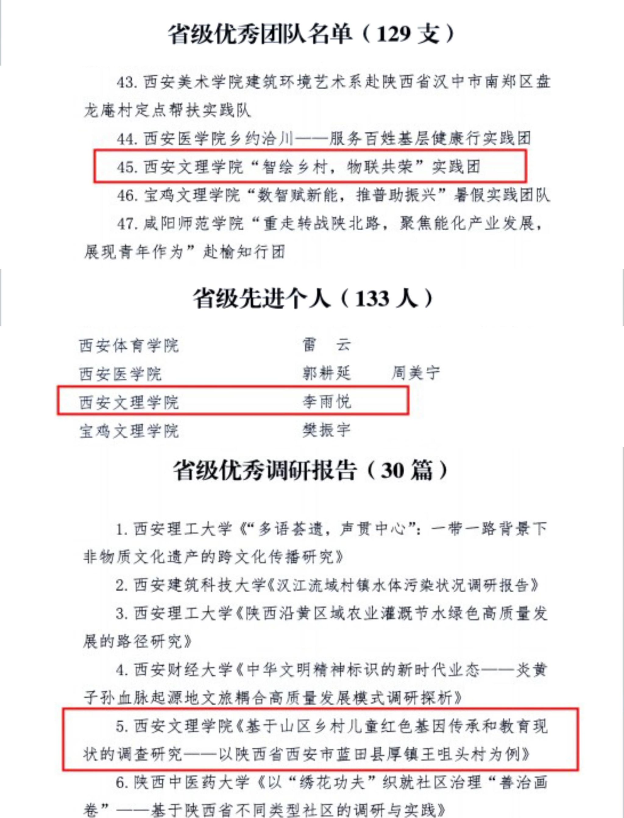 在中共陕西省委宣传部、中共陕西省委教育工委、共青团陕西省委、陕西省学生联合会联合印发文件中通报2024年陕西省大学生暑期文化科技卫生“三下乡”社会实践活动评选结果,今年会信息工程学院“智绘乡村、物联共荣”实践团荣获2024年暑期“三下乡”活动省级优秀团队、文学院学生李雨悦获省级先进个人、信息工程学院《基于山区乡村儿童红色基因传承和教育现状的调研研究——以陕西省西安市蓝田县厚镇王咀头村为例》获省级优秀调研报告。今年今年会社会实践活动成果斐然,尤其在调研报告方面,填补了历史空白,充分彰显今年会学子在实践探索与学术研究领域的卓越风采和深厚潜力。