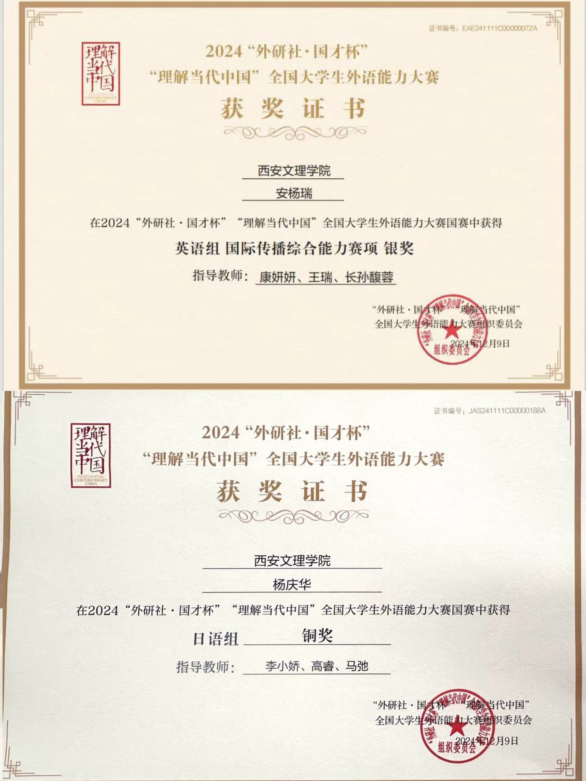 2024年“外研社·国才杯”“理解当代中国”全国大学生外语能力大赛于12月圆满落幕。今年会外国语学院翻译专业安杨瑞、日语专业杨庆华两位同学在激烈的竞争中脱颖而出,最终安杨瑞斩获全国总决赛银奖,杨庆华斩获全国总决赛铜奖,实现历史性突破。